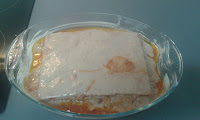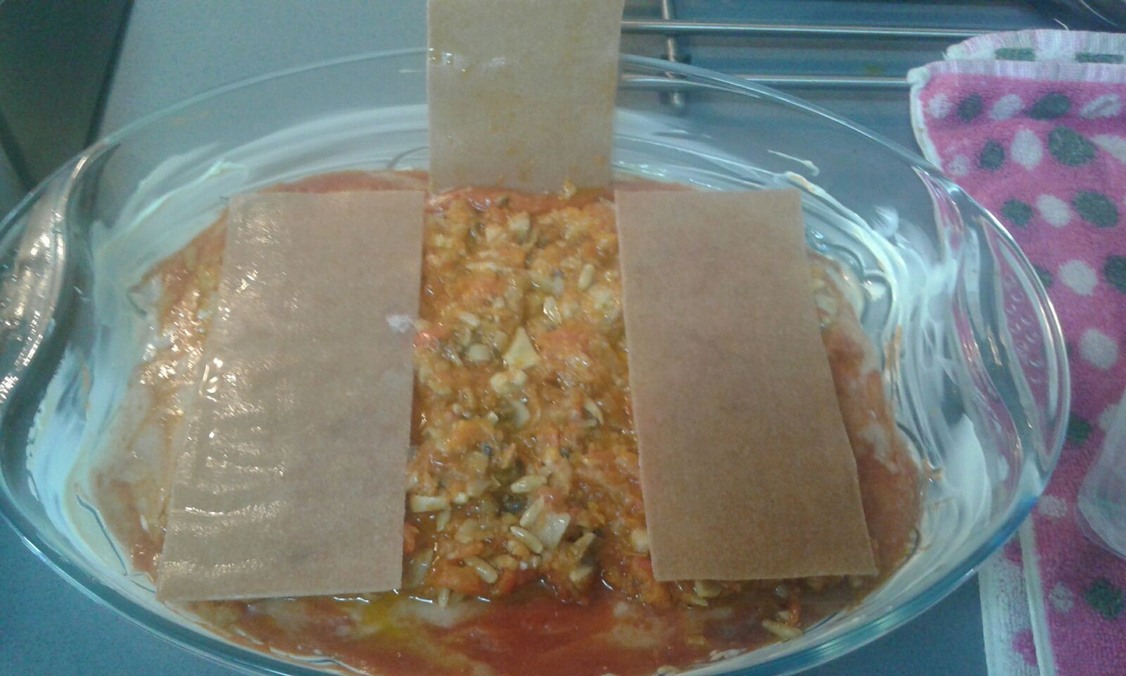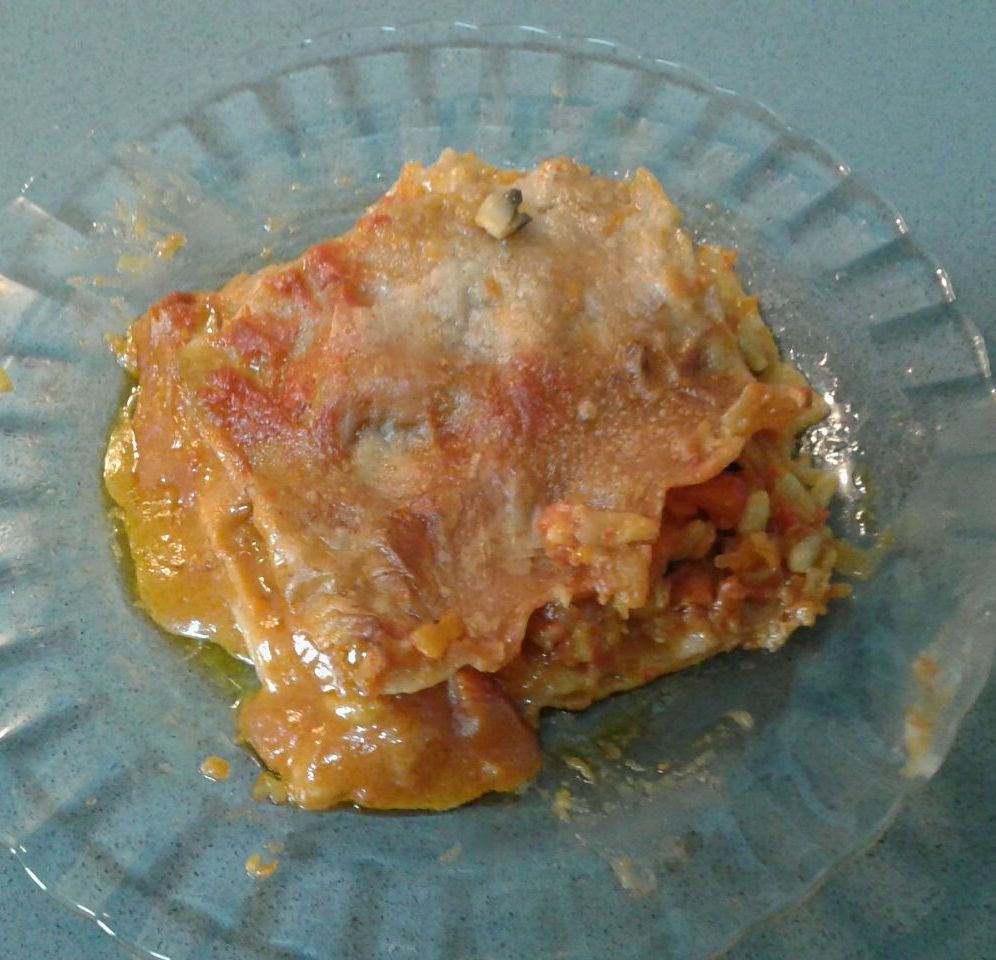 Una vez que tengamos todas las obleas secas, pondremos un poco de tomate frito en una bandeja de horno y a continuación colocaremos una fila de obleas, rellenamos con el sofrito y otra capa de obleas con un poco de tomate frito y el sofrito otra vez y así sucesivamente. Podremos poner un poco de queso vegano, esto es opcional y al gusto.
