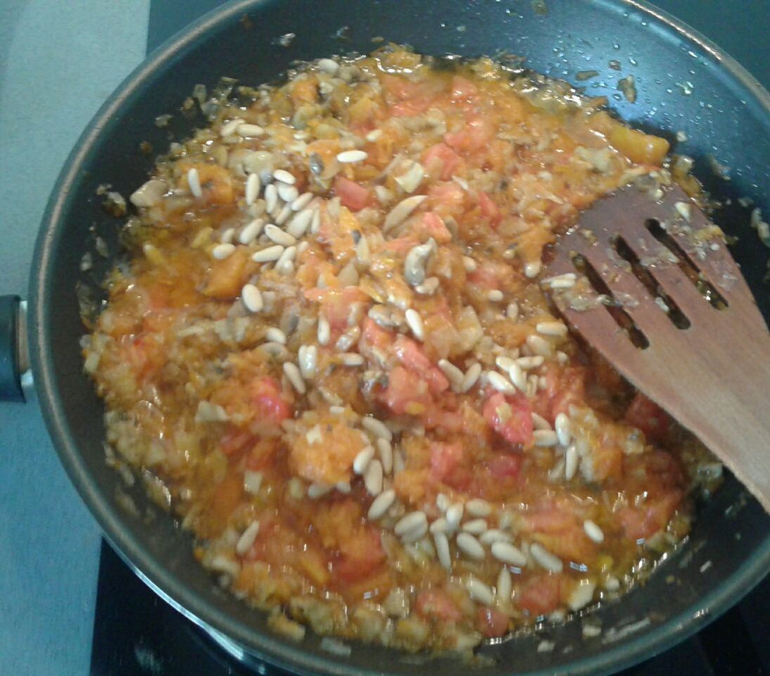 En cuanto tengamos la calabaza cocida y cortada a dados la añadimos al sofrito y agregamos los piñones y la sal marina. Reservamos el sofrito.