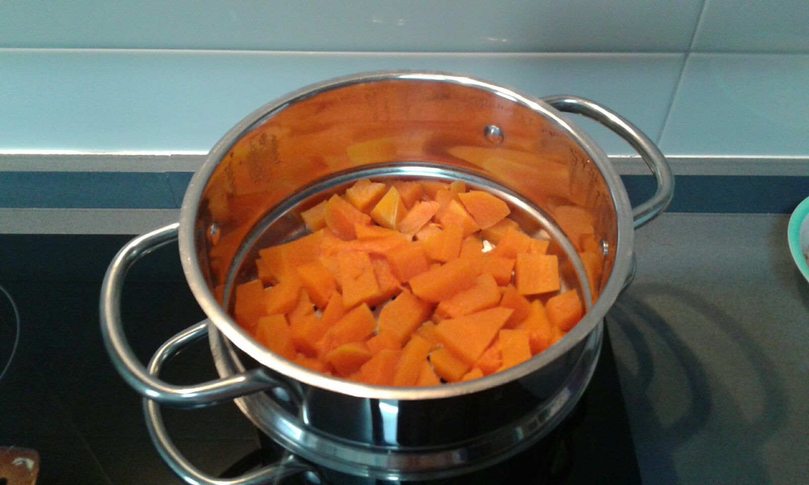 Ponemos la calabaza naranja a cocer (aproximadamente unos 20 minutos pero depende un poco del tamaño de las piezas) o al vapor, mientras tanto en la sartén haremos un sofrito con la cebolla, el tomate natural, los champiñones, la cúrcuma y la pimienta negra.