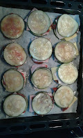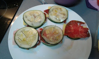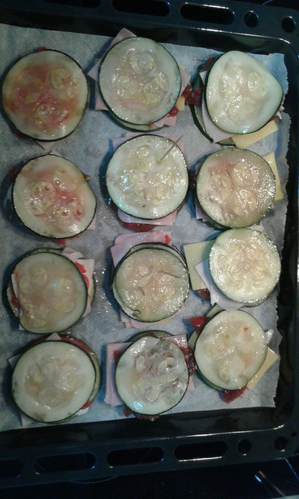 – En una bandeja de horno colocamos una rodaja de calabacín, encima un trocito de queso, un trocito de embutido vegetal, una rodaja de tomate natural y encima otra rodaja de calabacín.
