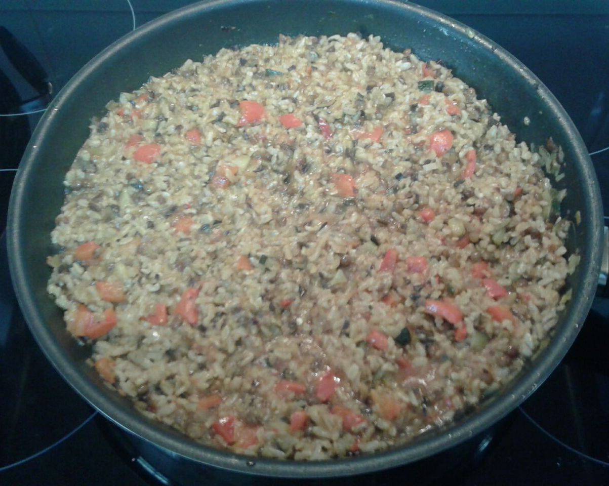 - Lo primero poner a cocer el preparado de arroz, lentejas y algas (2 de agua por 1 de arroz). Mientras tanto vamos haciendo el sofrito de las verduras.