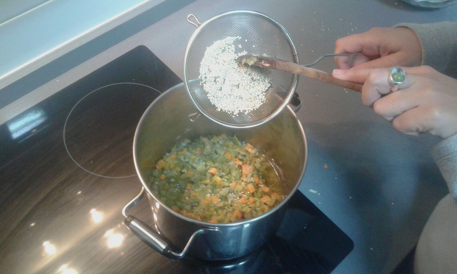 - Cuando estén pochadas, vertemos la quínoa (previamente lavada) y le damos unas vueltas junto con las verduras.
