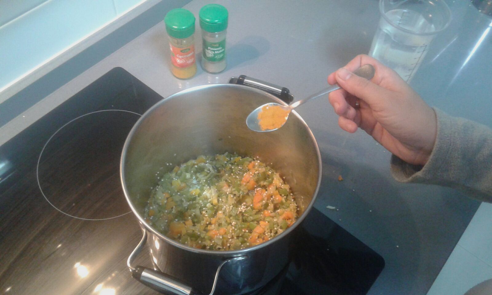 - Añadimos la cúrcuma, pimienta negra y sal (al gusto), y lo mezclamos todo junto.