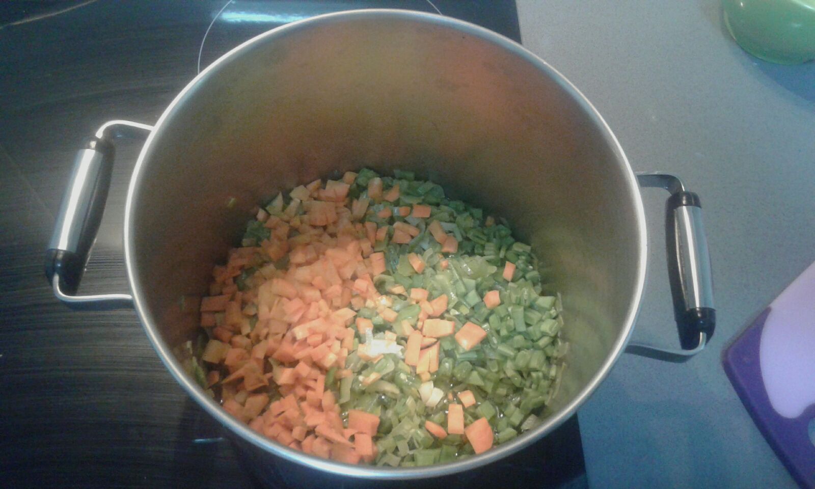 - Ponemos en una olla el aceite, cuando esté caliente añadimos las verduras y las dejamos pochar a fuego lento.